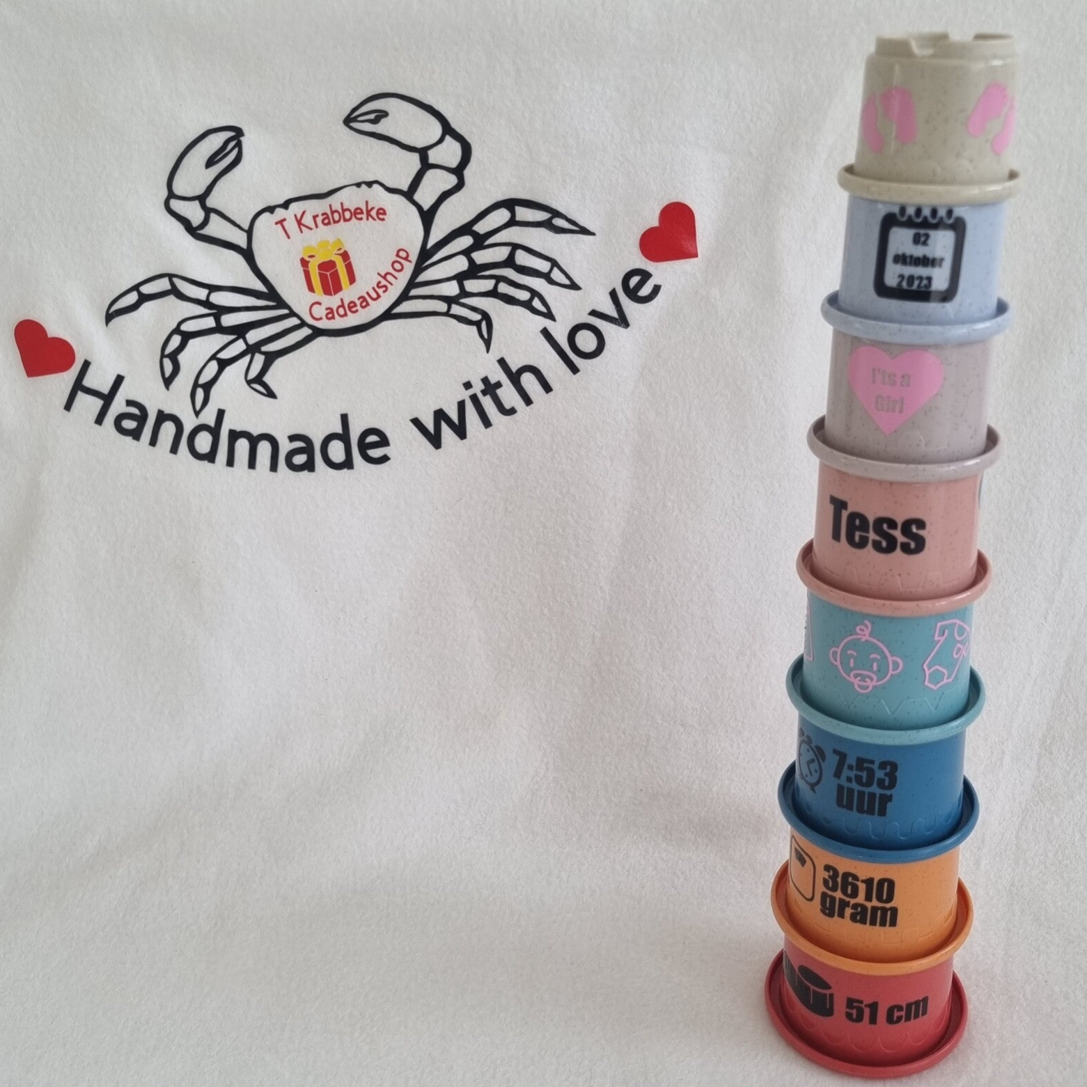 Gepersonaliseerde stapeltoren met de geboortegegevens van het kindje. Liever een andere kleur bedrukking neem dan contact met me op voor de mogelijkheden.