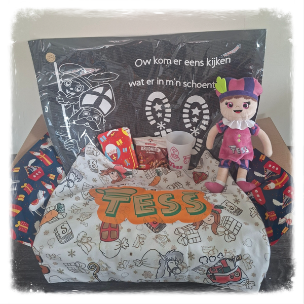Het pakket bestaat uit een: - Pietenknuffel met naam - Kussenhoes met of zonder naam - Bekerr met naam - Schoenen zet mat - Een klein zakje kruitnootjes - En niet te vergeten een verrassing